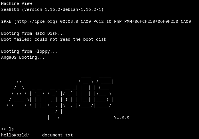 >> AngaOS is a very bare bones implementation of a bootloader, kernel & operating systemThis project is still under development, but i've added some basic features like ls, mkdir, cd, rm & touch, and they all do exactly what you think they do, and should work they same as on linux