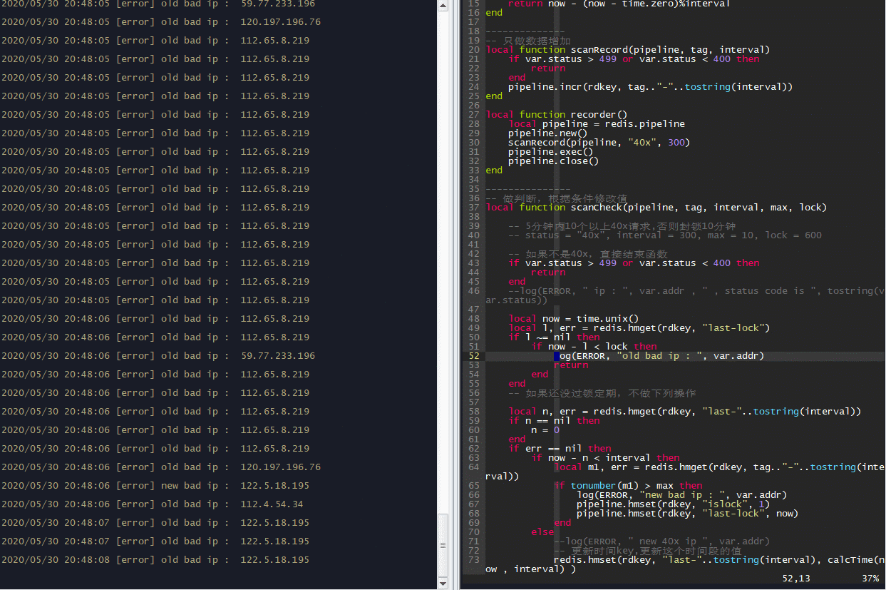需求:对5分钟内的访问状态码40x的ip进行针对统计,5分钟内超过100次的打上标签锁定10分钟,供WAF进行拦截。