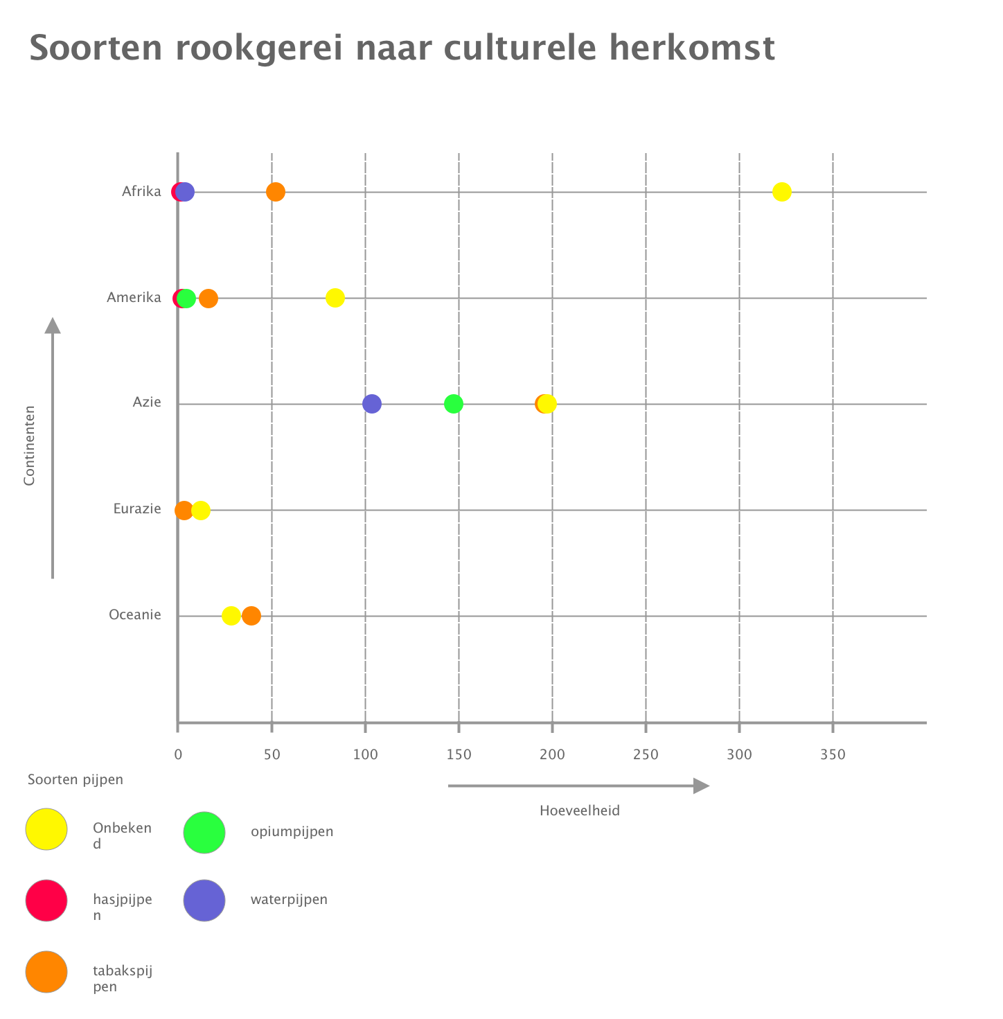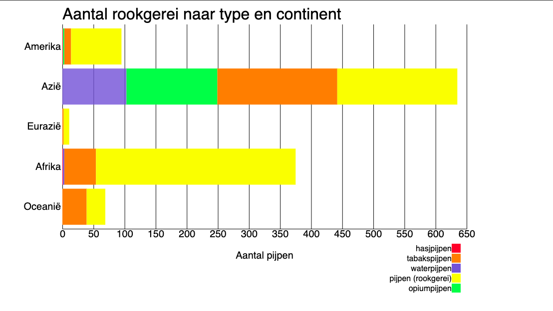 The concept is a stacked bar chart that visualizes the amounts of smoke pipes that are in the collection of the museums. The colors represent the types of pipes(opiumpipes, tobaccopipes etc.) and they are grouped by the continent they originate from. If you want to read through my whole concept checkout the project Wiki
