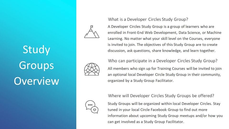 This group is dedicated for discussion amongst Developer Circles Study Group Facilitators. Facilitators are volunteers who will be leading study groups with Developer Circle members participating in training groups.