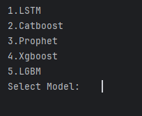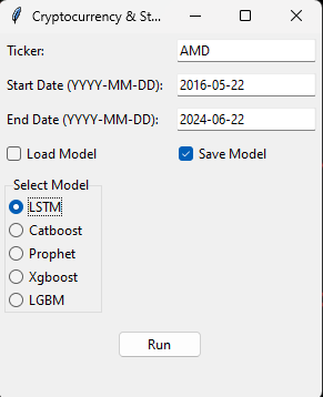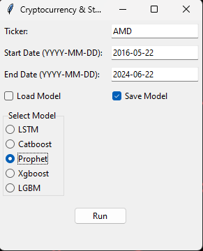 Main.py & GUI.py files let's you select model, start & end date, available models are: Lstm, Catboost, Prophet, XGBoost, LGBM and Random Forest.