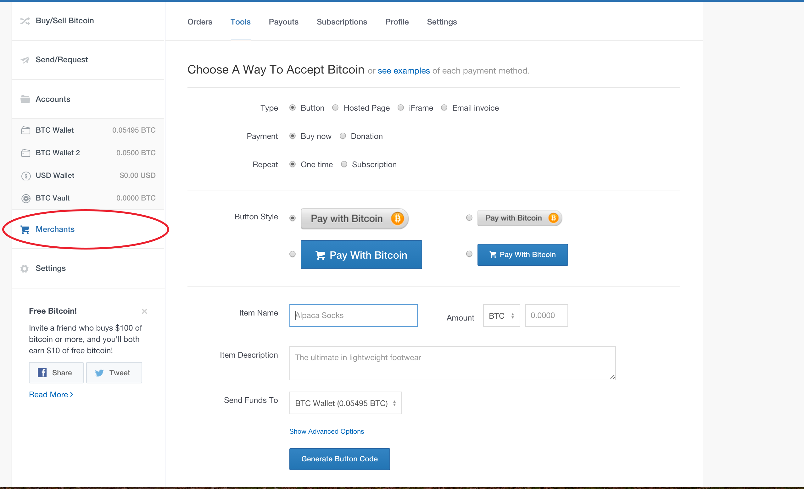 If you wish to accept BTC payments on your account, you must also set up a merchant profile. This option is not visible on the default dashboard for some reason, however you can access merchant tools via the following link: