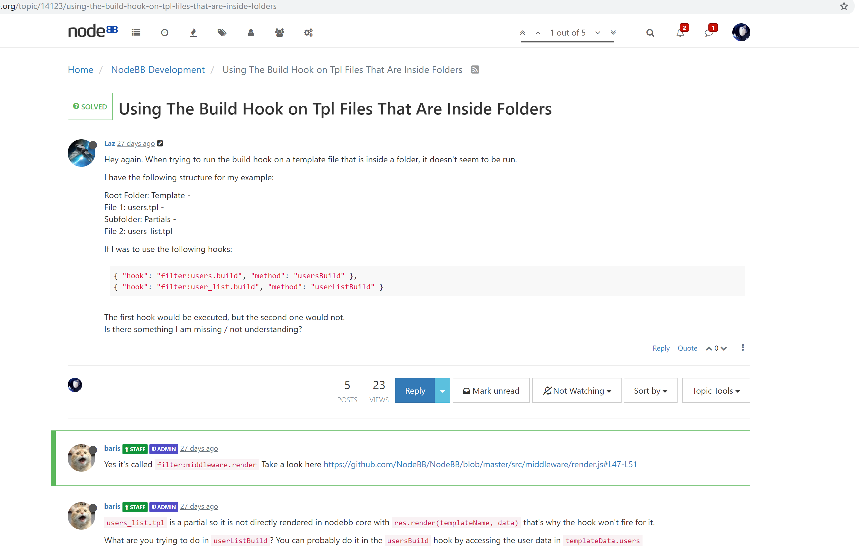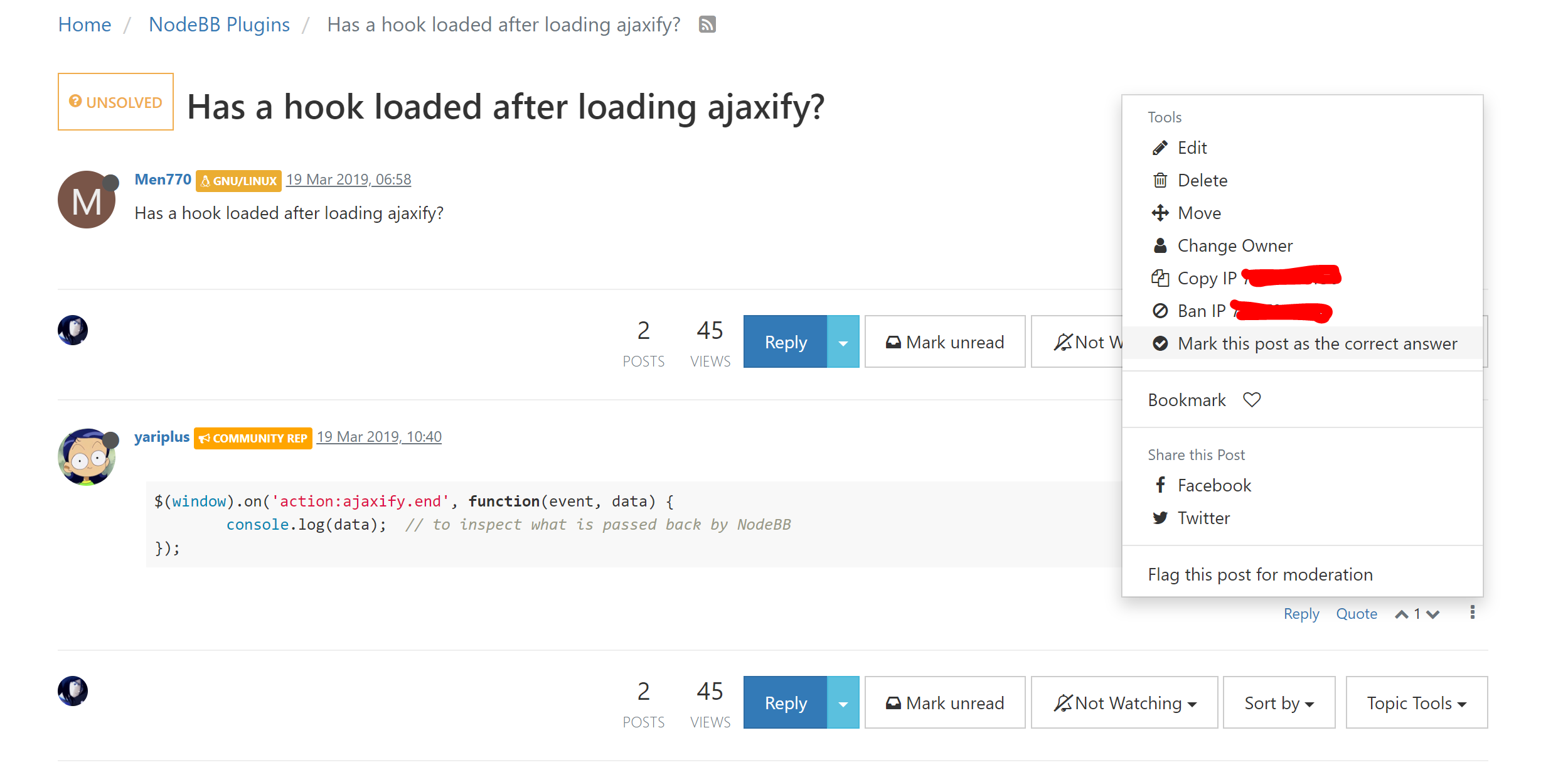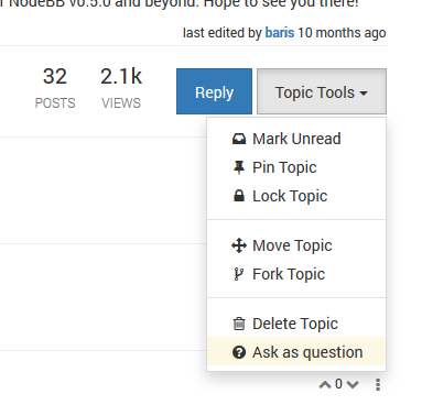 Question and Answer Plugin for NodeBB A Q&A plugin for NodeBB Forums which allows users to post topics as questions and label it as solved. Installation npm install nodebb-plugin-question-and-answer Screenshots In the composer you can post a topic as a question thread: Or, you can convert it to a question from thread tools: Mark your question as solved via thread tools: Or if there is a specific post that solved your question, the post tools popup gives you the option to select that answer: The accepted answer will be promoted to the top of the page: And here is how it looks like in the category view, recent, popular, etc: A navigation route is available, so you can see the most recent unsolved threads. Just activate it in ACP -> General -> Navigation: