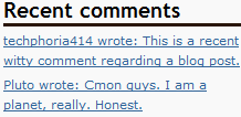 This component displays the most recent comments made on entries in your blog. The number of comments displayed is set on the blog home item.