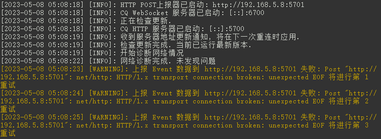 上报 Event 数据到 http://192.168.5.8:5701 失败: Post "http://192.168.5.8:5701": net/http: HTTP/1.x transport connection broken: unexpected EOF 将进行第 2 重试
