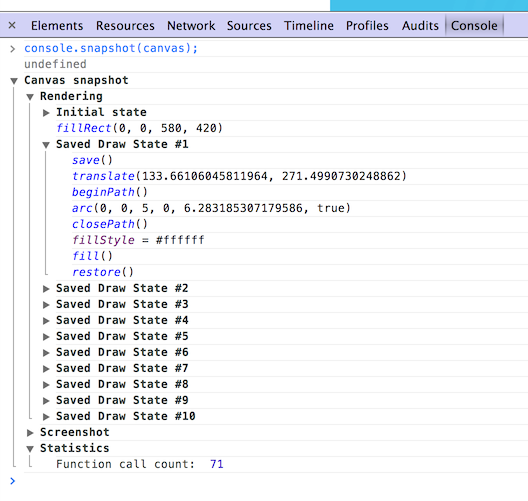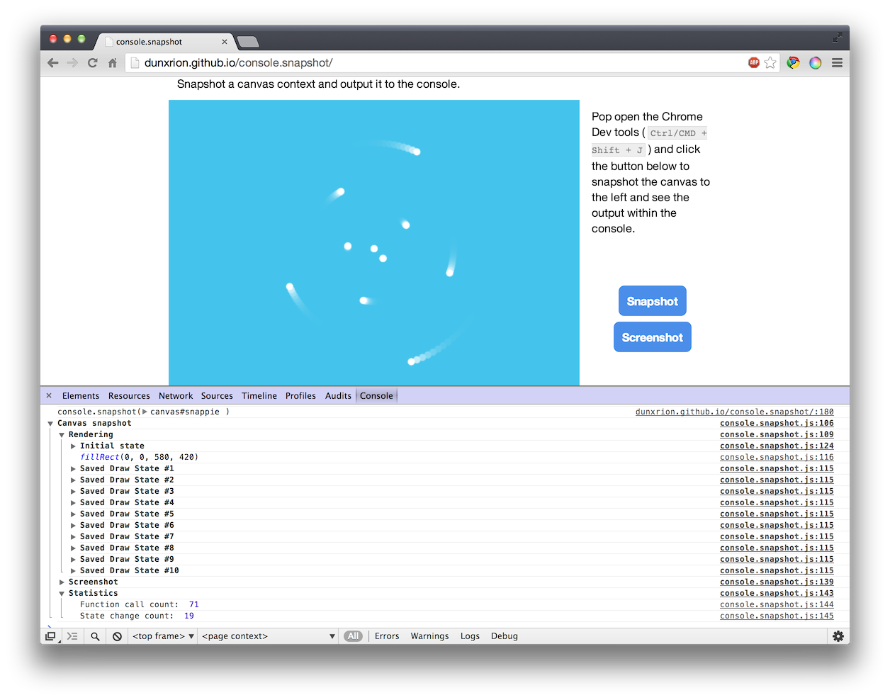 console.snapshot takes and inputted <canvas> element and outputs a snapshot of it into the console. It makes debugging the canvas a little less dramatic. See this demo. console.snapshot is a fork of the console.image and actually does something useful.