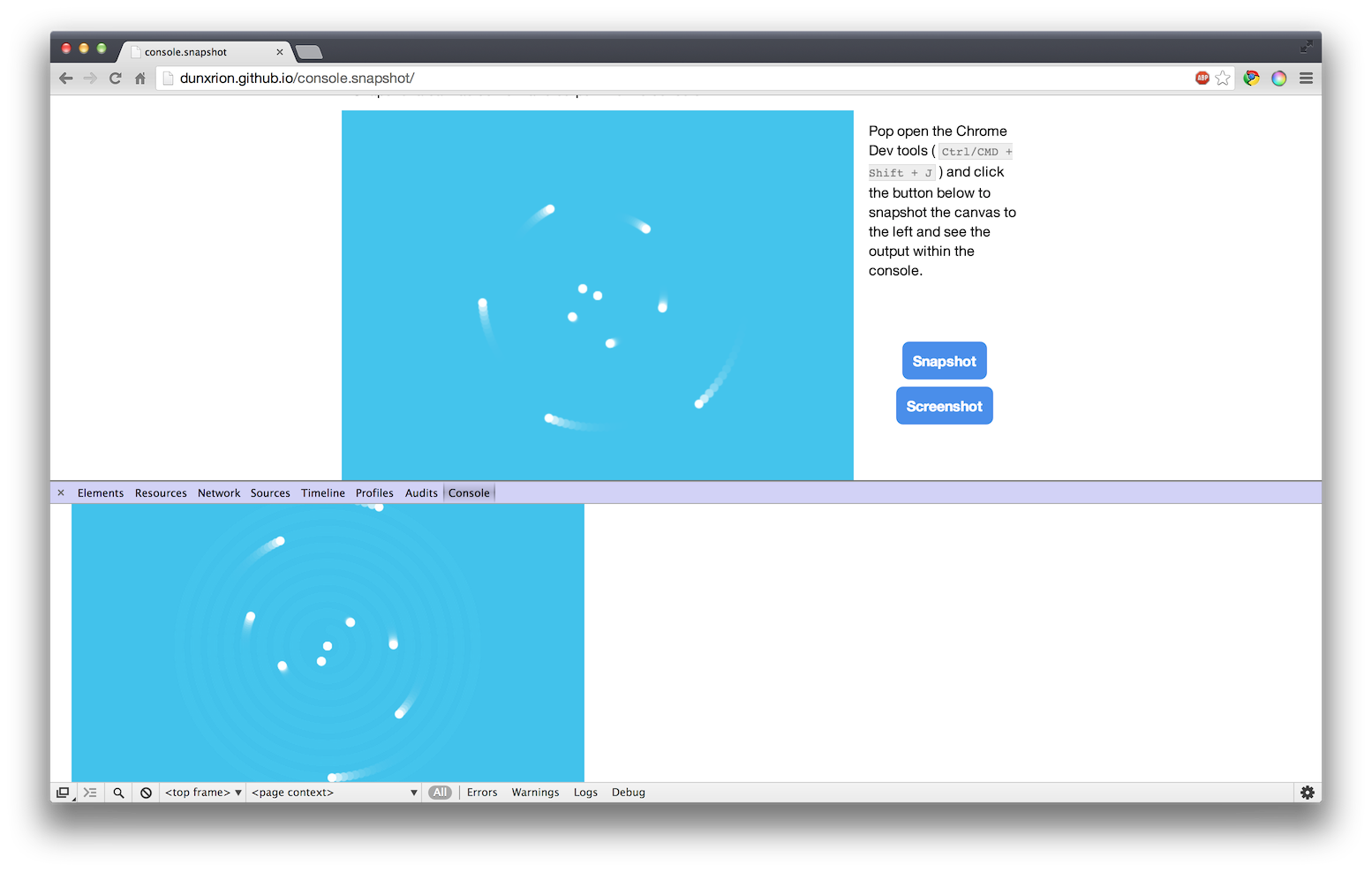 console.snapshot(canvas);console.screenshot takes in a HTMLCanvasElement, base64 encodes it using toDataURL and then outputs it to the canvas using console.image. You can also pass along an optional scale factor to scale down the outputted image for better viewing within the Dev tools.