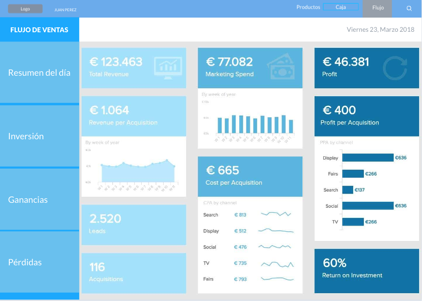 - Flujo de ventas por dia a travez de un data dashboard (no funcional por ahora).