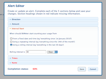 BitMeter OS also lets you define Alerts to notify you when your internet usage exceeds some limit that you specify.
