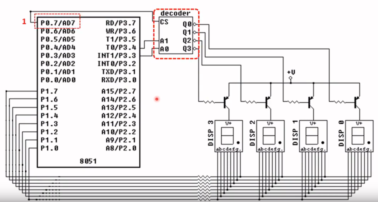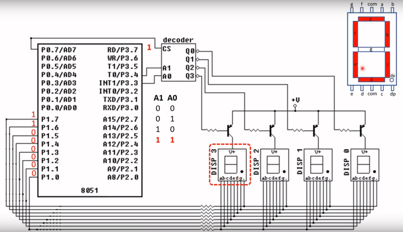PORT3.3 (P3.3): Este pino é uma entrada do Decoder (A0), utilizar para selecionar qual Display de 7 Segmentos deve ser ativado.
