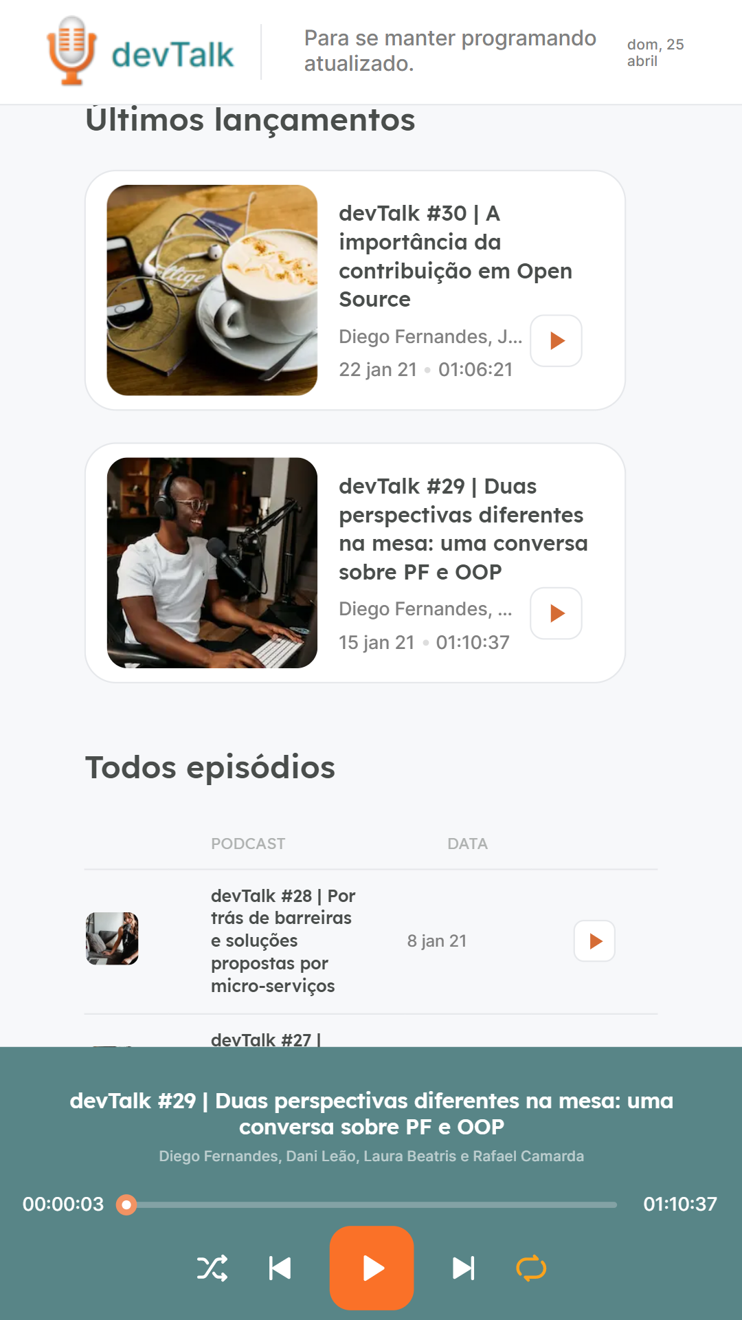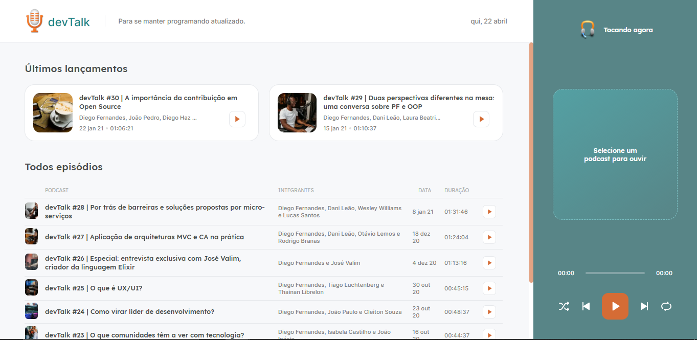 ## 💻 Project O # devTalk é uma aplicação que foi desenvolvida durante a Next Level Week 5 de React da RocketSeat. A aplicação permite a execução de um Player com Podcasts.