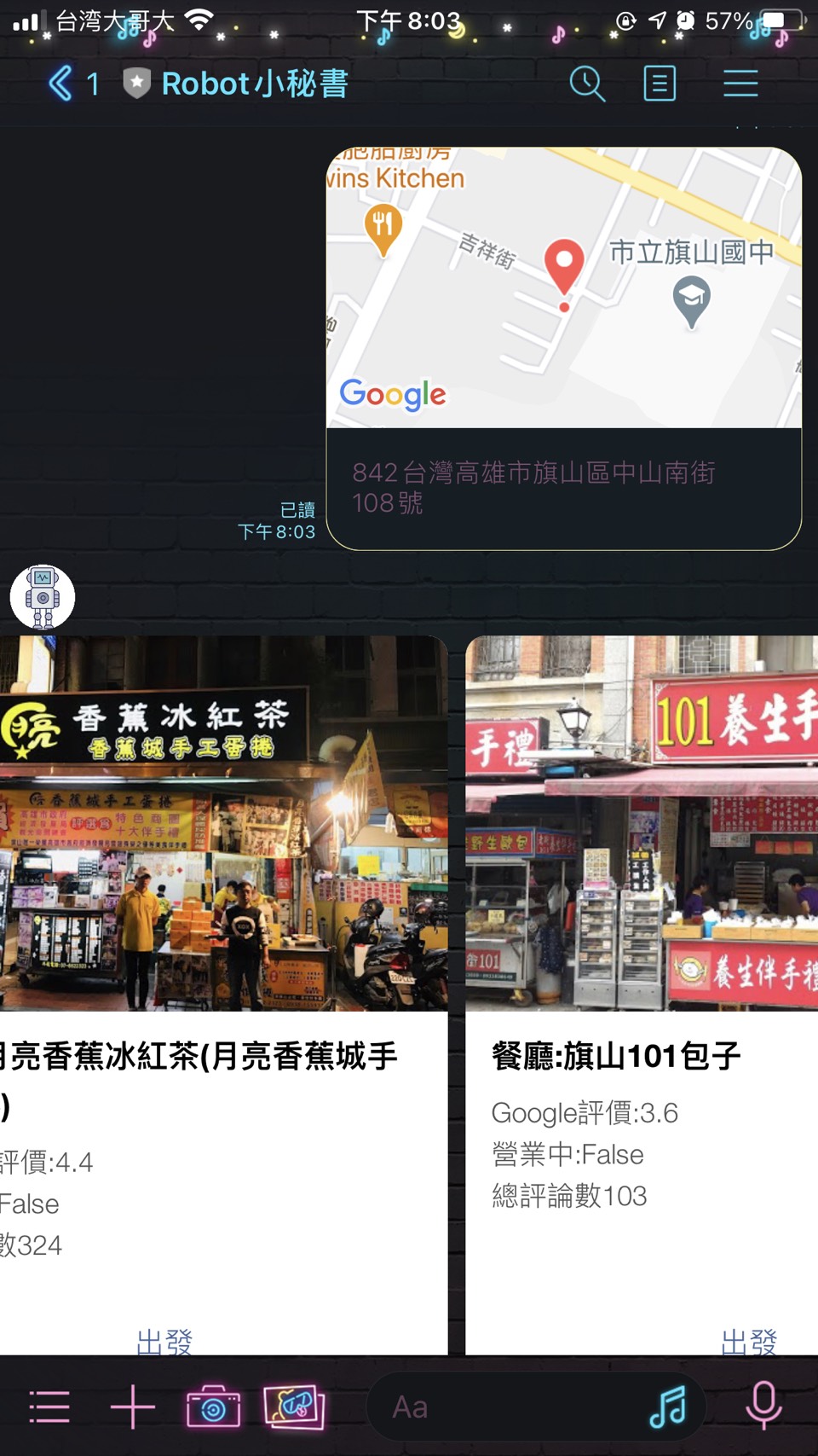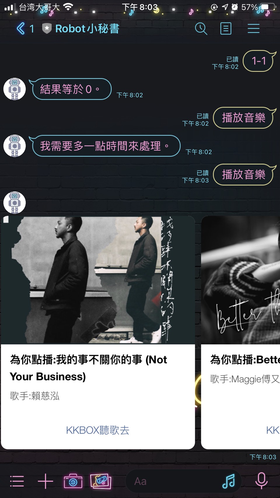 line bot : ROBOT小秘書 ID:@627tmjef by 王冠智 (instagram) 功能 1. 普通聊天對話 2. 按 + 傳送位置訊息,跑出附近餐廳 3. YAHOO最新電影 4. KKBOX隨機單曲 5. 抽美女或。。。 6. 聯合報即時新聞 7. DCARD西斯版