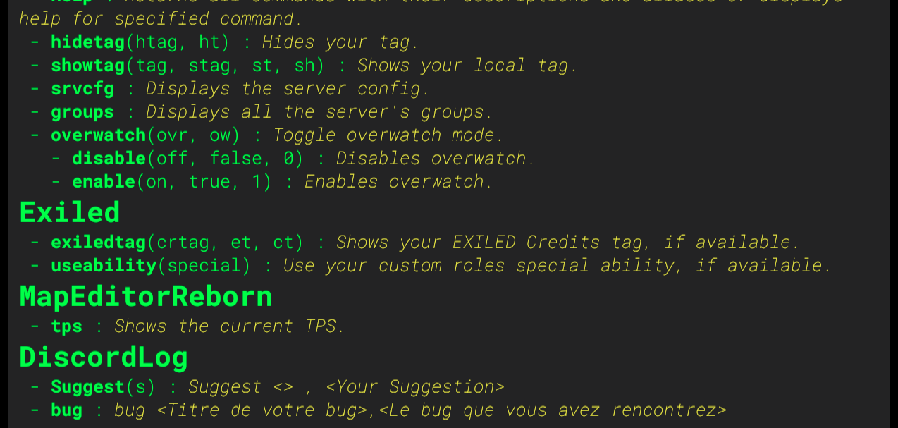 Better Help Command An EXILED plugin that improves the help command by making it more readable. Installation Download the latest release from the Releases page. Place the downloaded BetterHelpCommand.dll file in your EXILED Plugins folder