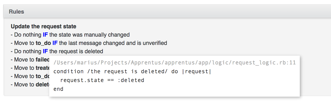 RequestLogic.html_rules(show_code: true)Here's an example. The box around is made by activeadmin.