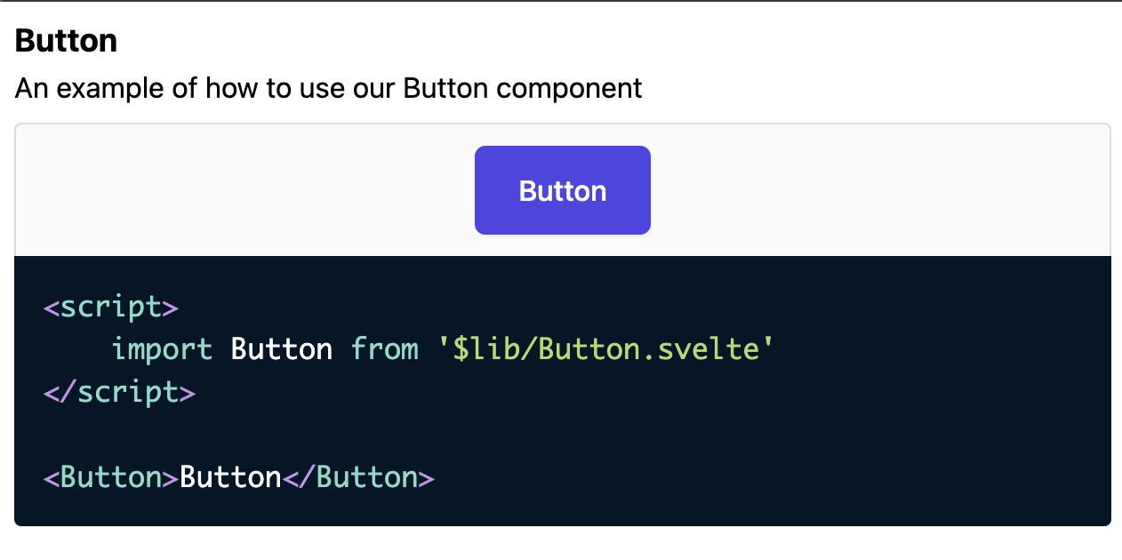 Example code blocks are rendered with a Svelte component. You can provide your own if you wish to customize its look or behaviour.