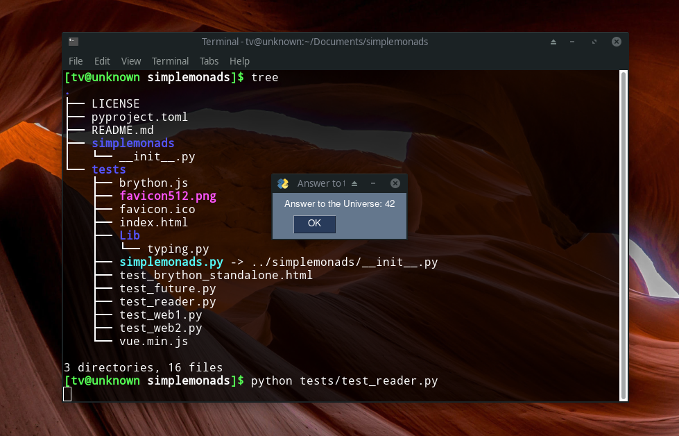 Just pip install simplemonads and you're done. You can also download this single file into your project and use it as you wish without dependencies. Works across all platforms, so CPython >= 3.5 (Windows, Linux, Mac, Android, iOS), in a single standalone html file, multiple files in the browser with dynamic loading, and even on microcontrollers with micropython.