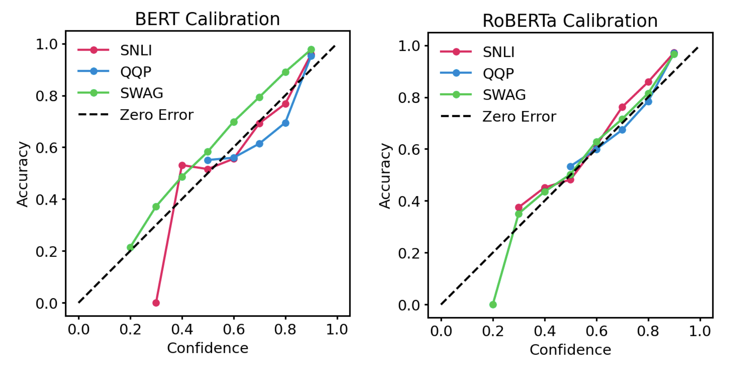 To measure calibration error, we chiefly use expected calibration error (ECE), where ECE = 0 indicates perfect calibration. When used in-domain, pre-trained models (BERT, RoBERTa) are generally much more calibrated than non-pre-trained models (DA, ESIM). For example, on SWAG: