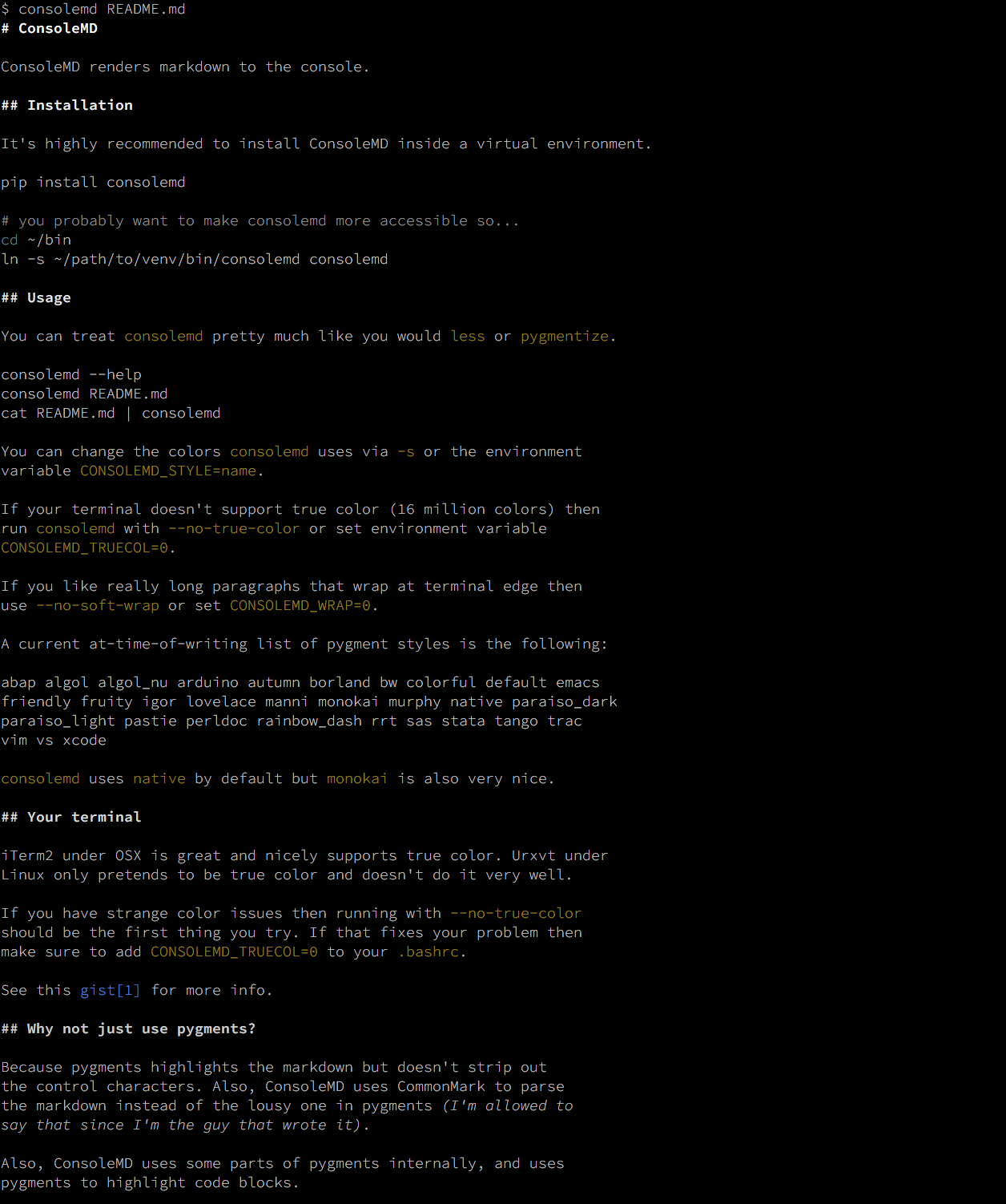 python setup.py test # this will install some extra deps and run testsYou can treat consolemd pretty much like you would less or pygmentize.