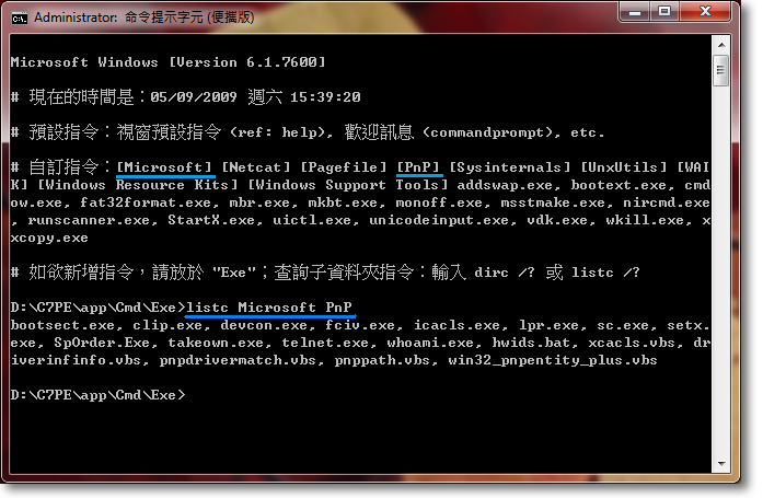 OK. Utilities in subfolders are all handled by PATH now, but what if I don't remember the name of an executable at all? Then I would first need to see what's inside subfolders using Dirc.bat or Listc.bat which are a part of ECPP.