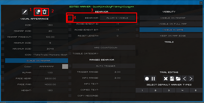 <MarkerCategory name="extrail" DisplayName="Example Trail" texture="Data/ExamplePack/Markers/Trail.png" fadeNear="3000" fadeFar="3500"/>